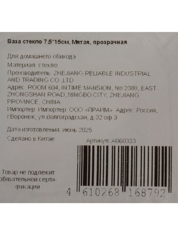 Ваза выполнена из прочного прозрачного стекла, устойчива к царапинам и не теряет прозрачность со временем. При бережном уходе прослужит много лет без потери внешнего вида.