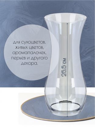 Высота 25,5 см, диаметр горла широкий, объём оптимален для средних и крупных букетов. Вес — 0,68 кг. Прозрачное стекло с омбре-переходом.