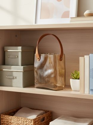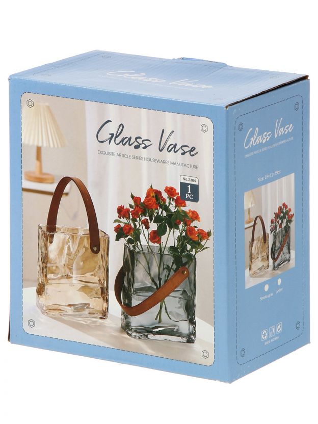 Ваза стеклянная настольная 18x11x19 см «Сумочка» с медовым оттенком и ручкой из экокожи — стильный акцент для дома и оригинальный подарок по доступной цене.