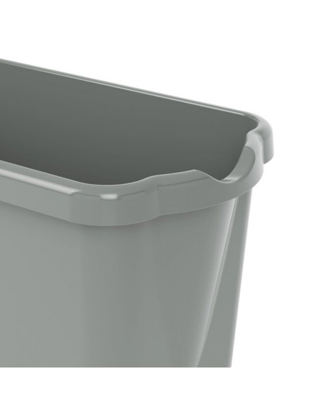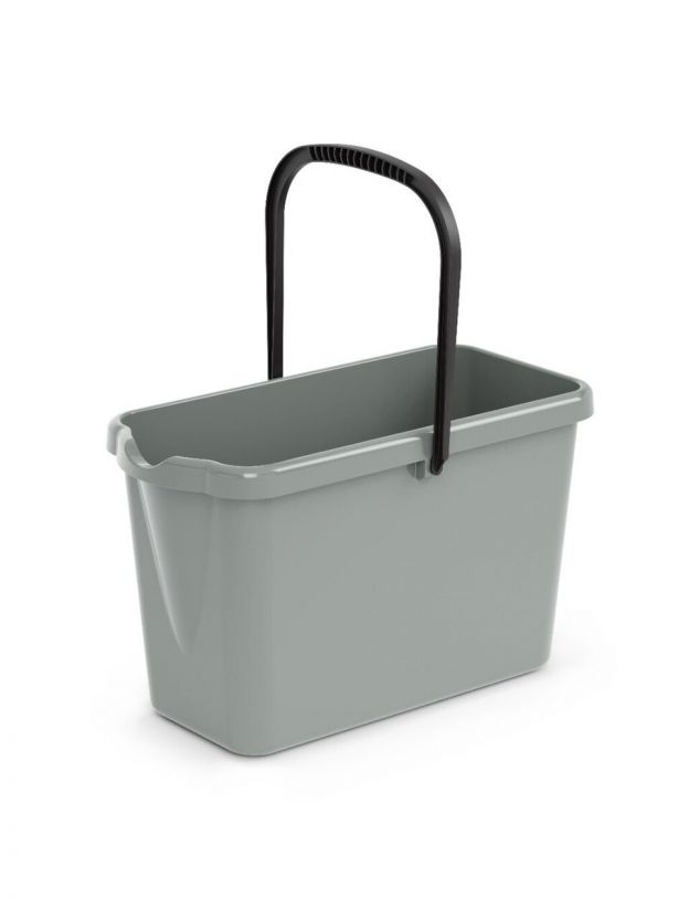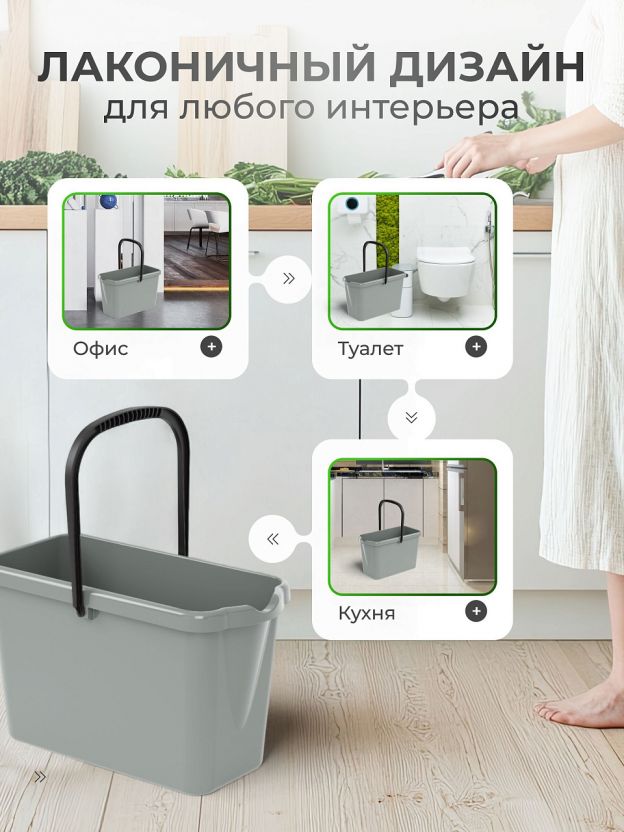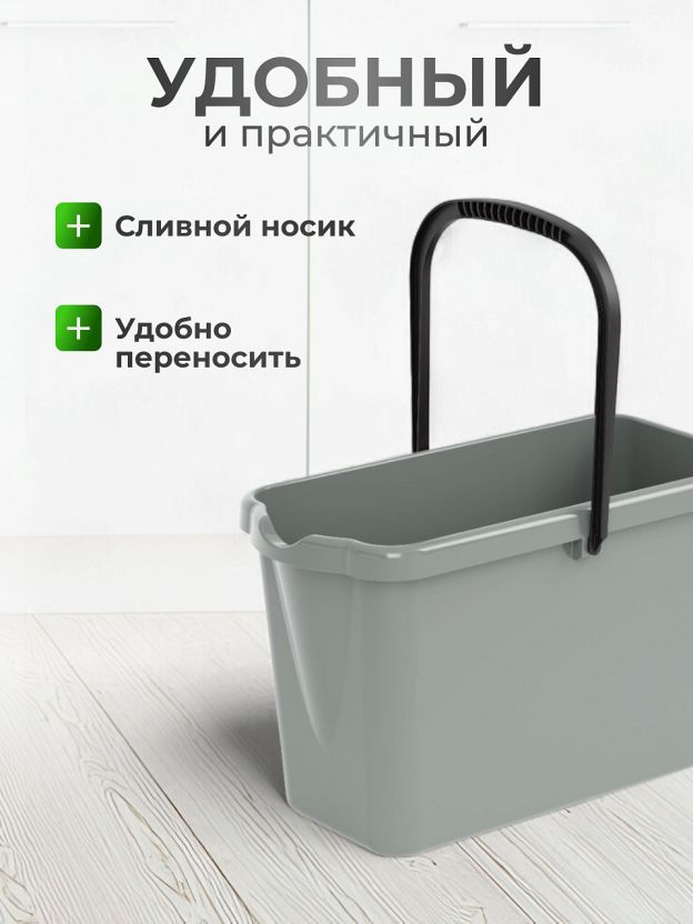 Высота ведра — 27,5 см, форма — прямоугольная, без крышки и отжима. Цвет — в ассортименте, ручка для переноски входит в комплект.