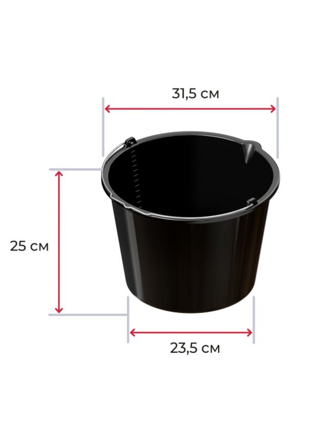 Ведро высотой 25 см, диаметр верха — 31,5 см, дна — 23,5 см. Оснащено сливным носиком и мерной шкалой для точного дозирования.