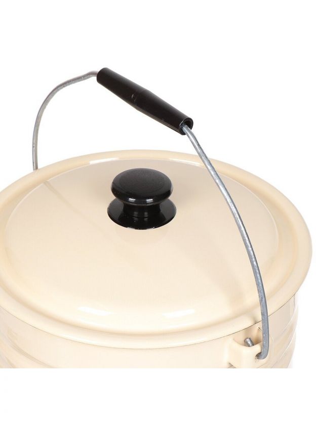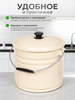 Эмалированное покрытие обеспечивает надежную защиту от коррозии, продлевая срок службы изделия и облегчая уход за поверхностью. Сталь отличается прочностью и устойчивостью к механическим повреждениям, что особенно важно для ежедневного использования. Крышка в комплекте позволяет удобно хранить содержимое, предотвращая попадание пыли и посторонних запахов. Ручка с накладкой обеспечивает комфорт при переноске даже наполненного ведра, а железная конструкция ручки гарантирует дополнительную прочность.
