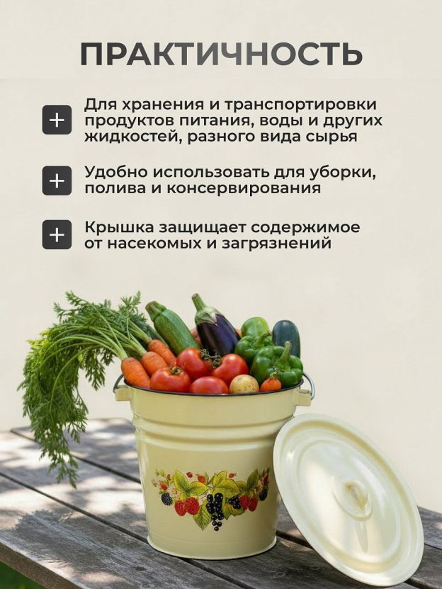 Эмалированное ведро 12 л с крышкой СтальЭмаль: универсальное решение для хранения и хозяйства, долговечность и безопасность для пищевых продуктов.