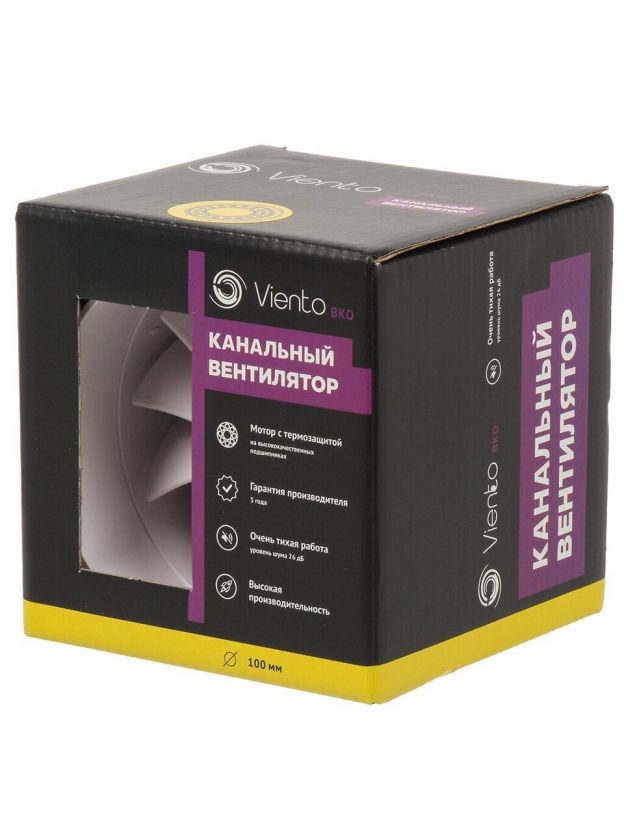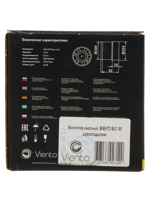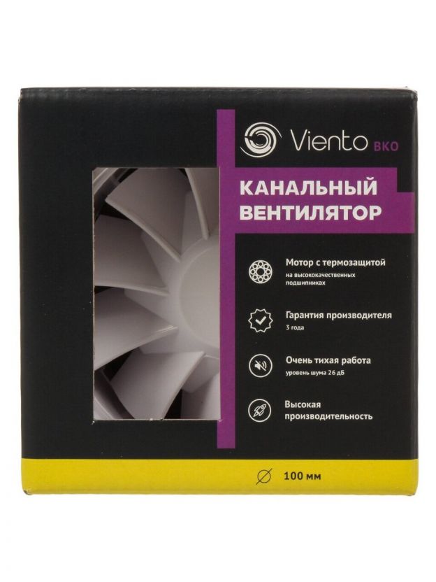 Вентилятор канальный, Viento, установочный диаметр 100 мм, 13 Вт, 130 м3/ч, ВКО100-B