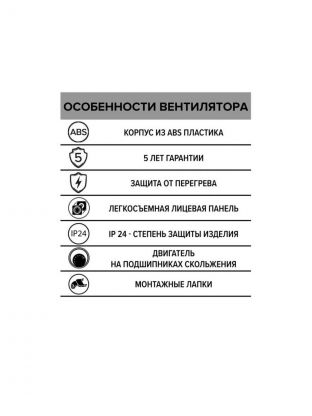 Корпус и крыльчатка выполнены из высококачественного и прочного ABS-пластика, который надежно прослужит долгое время и не пожелтеет, что позволит сохранить эстетичный вид вентилятора на протяжении всего срока службы.