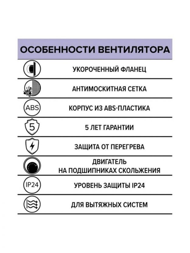 Вентилятор оснащен мощностью 14 Вт, что обеспечивает производительность до 100 м3/ч. Это значит, что он способен быстро и эффективно справляться с задачами по вытяжке воздуха, создавая комфортную атмосферу в помещении. Вентилятор выполнен из прочного пластика белого цвета, что делает его не только функциональным, но и стильным дополнением интерьера.