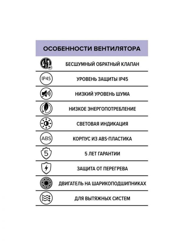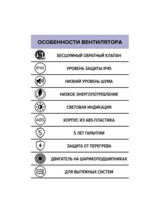 Изготовленный из прочного пластика, вентилятор устойчив к воздействию влаги, что подтверждается уровнем защиты IP45. Дополнительная защита от перегрева гарантирует долговечность и надежность устройства. Продукт поставляется с гарантией от производителя на 60 месяцев, что подчеркивает его качество и надежность.