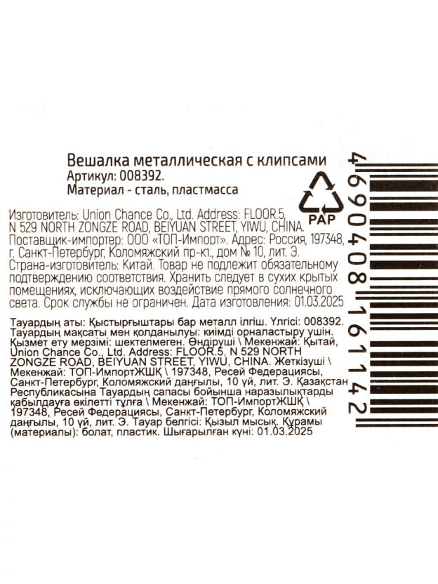 Вешалка выполнена из стали с пластиковыми элементами, что обеспечивает прочность, устойчивость к деформации и долгий срок службы даже при частом использовании.