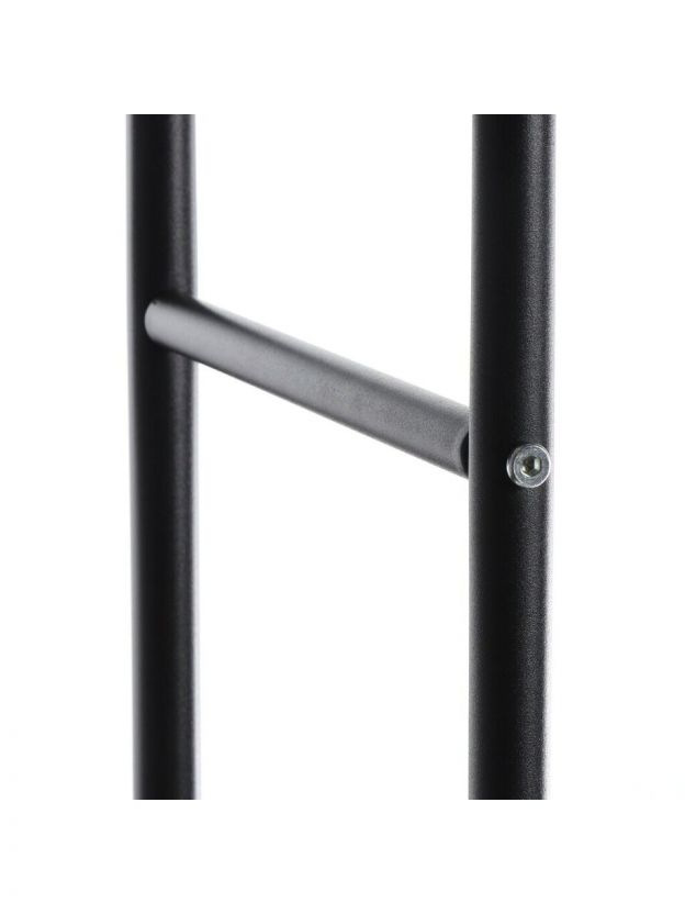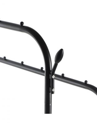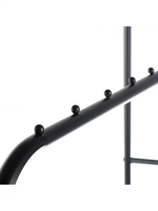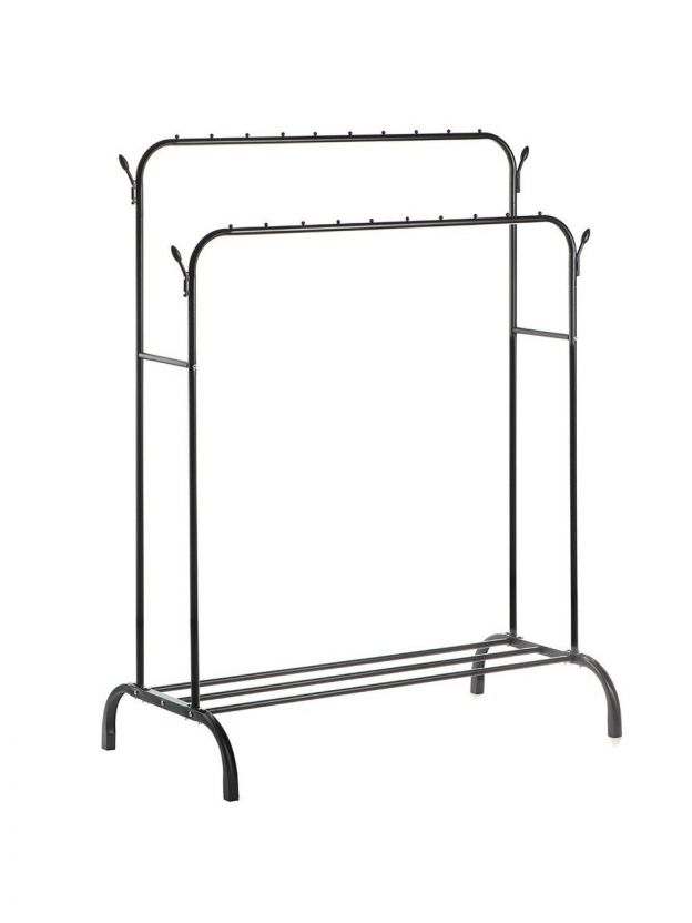 Размер: 110x55x150 см. Материал: металл с защитным покрытием. Цвет: чёрный. Нет колёс, есть полка для обуви и дополнительные крючки.