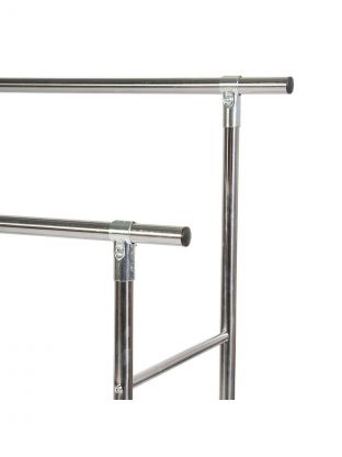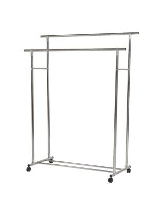 Ширина — 120х100 см, глубина — 50 см, высота — 150 см. Материал — металл, цвет — серебристый. Конструкция без крючков, с рейлами для одежды, брюк, юбок, шарфов, ремней и галстуков.