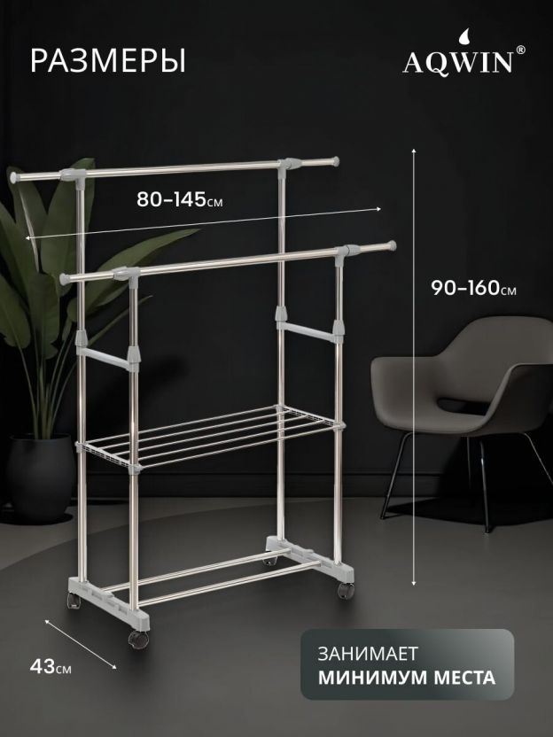 Да, телескопическая регулировка размеров (ширина 145 см, глубина 43 см, высота 160 см) и мобильные колёса делают вешалку Aqwin удобной для компактных пространств и сезонного хранения.