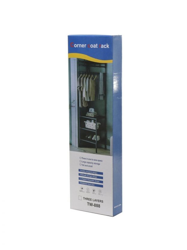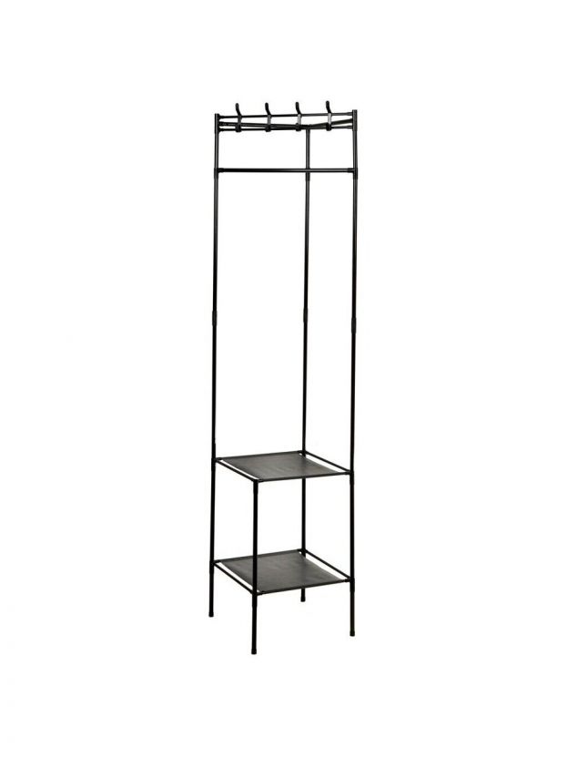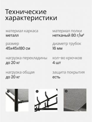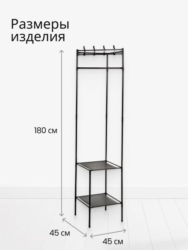 Ширина и глубина — 45 см, высота — 180 см, телескопическая, угловая, 4 крючка, цвет — чёрный, материал — металл, без колёс и полки для обуви.