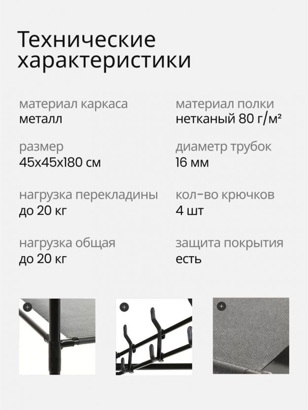 - Прочные металлические элементы, оптимальные размеры 45х45х180 см и 4 удобных крючка для одежды, галстуков и ремней.