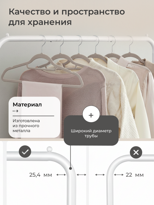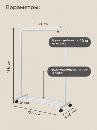 - Оптимальные размеры: 90,5x40,5x158 см, прочный металл, выдерживает до 50 кг — подходит для верхней одежды