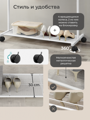 - Мобильность и универсальность: колёса и полка для обуви — всё для удобства в квартире, офисе или на даче