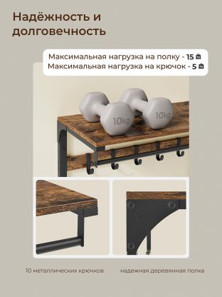 Вешалка оснащена 10 крючками, что позволяет удобно разместить верхнюю одежду, сумки и другие аксессуары, сохраняя порядок в прихожей или гардеробной. Благодаря наличию полки, можно использовать дополнительное пространство для хранения шляп, шарфов или декоративных элементов, добавляя уют и индивидуальность вашему дому.