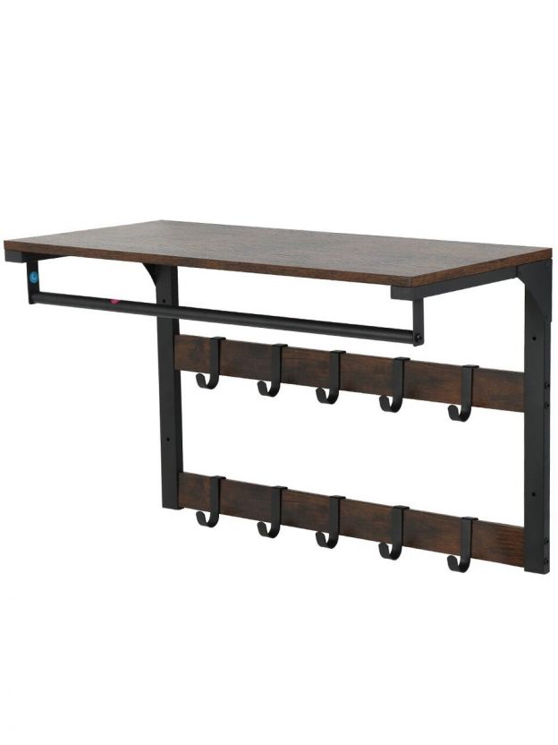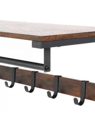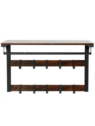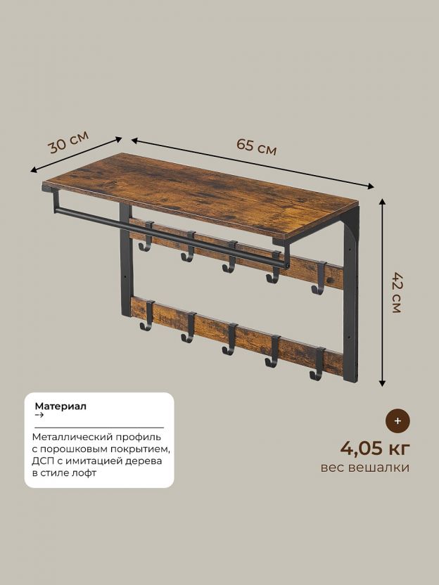 Вешалка настенная 10 крючков, с полкой, настенная, 65х30х42 см, ДСП, сталь, Лофт, LCR101B01, коричнево-черная