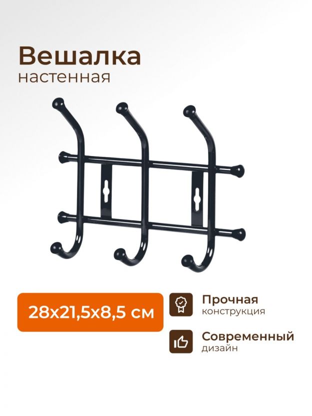 Вешалка настенная 3 крючка, настенная, 8.5х28х21.5 см, металл, Nika, ВНТ3, черная
