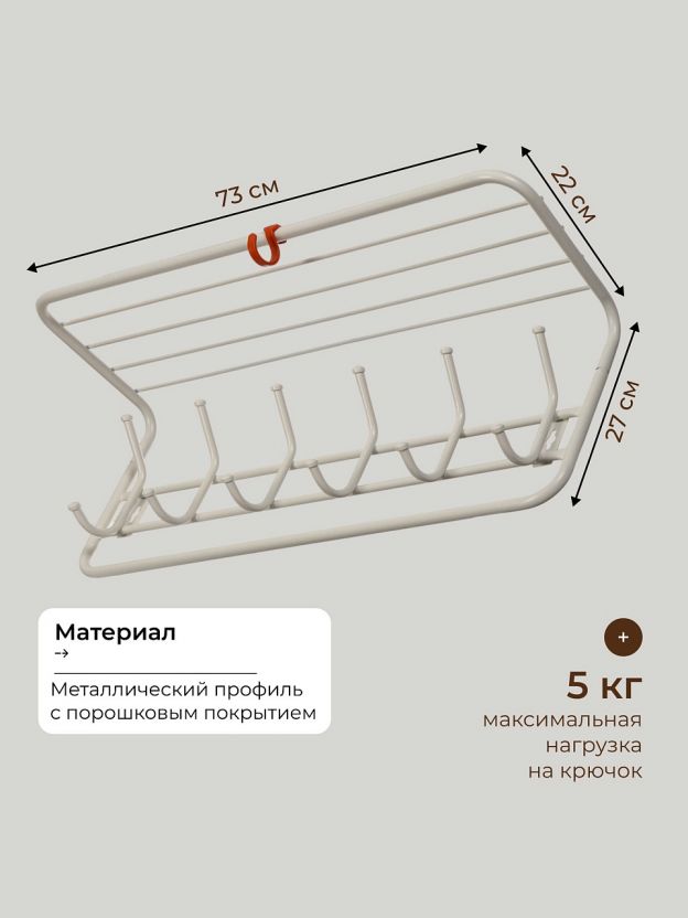 • конструкция изделия состоит из 6 крючков и полки под головные уборы.