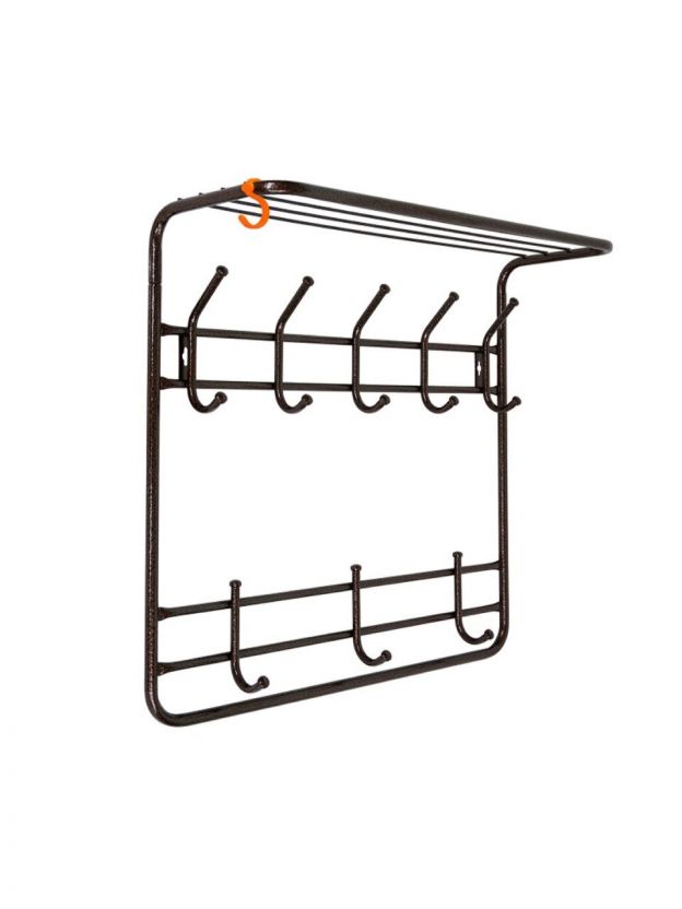 Вешалка с полкой подойдет для прихожей, офисных помещений и общественных заведений. Нижний ярус крючков расположен для размещения сумок, зонтов и детской одежды.
