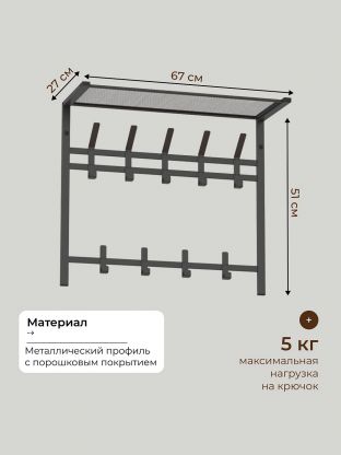 Вешалка настенная 9 крючков, с полкой, 67х27х51.3 см, сталь, ЗМИ, Торонто 22, ВСПТ22 ГР, графит