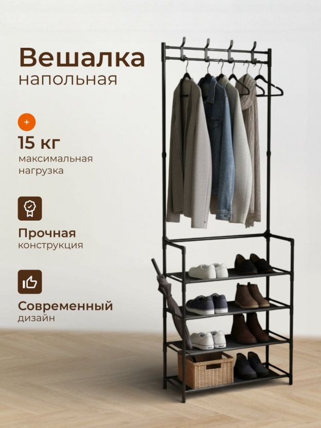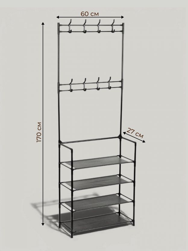 Вешалка-стойка напольная с 4 полками и 8 крючками — это продуманное решение для хранения одежды, обуви и аксессуаров. Такой вариант особенно актуален для тех, кто ищет, какую вешалку выбрать для прихожей или гардеробной, чтобы разместить не только куртки, но и юбки, шарфы, ремни, галстуки, обувь. Благодаря оптимальным размерам (170x60x27 см) и прочной конструкции стойка выдерживает до 15 кг, что выгодно отличает её от аналогичных моделей с меньшей грузоподъёмностью.