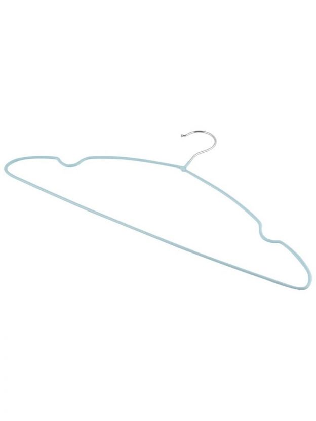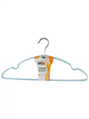 В комплекте 5 металлических вешалок с ПВХ-покрытием, длина каждой — 40 см, цвет — бирюзовый (артикул 006834).