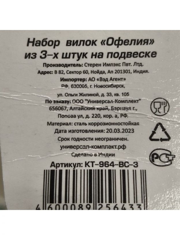 Вилка нержавеющая сталь, 3 предмета, столовая, Катунь, Офелия, КТ-964-ВС-3, на подвесе