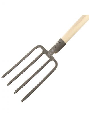 Вилы четырехрогие выполнены из закаленной стали, имеют обработанный черенок из древесины. Заостренные зубцы легко проникают в грунт, снижая нагрузку на ногу.