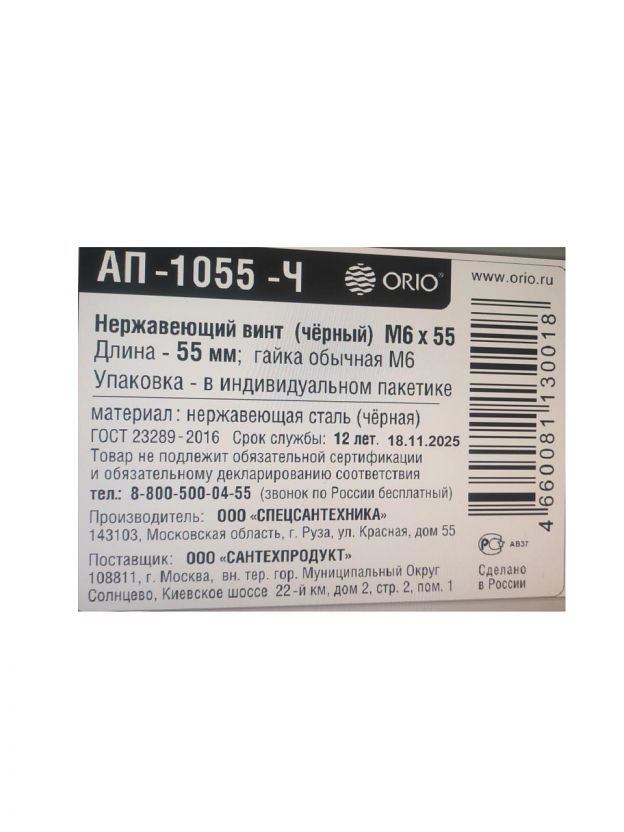 Винт для сифона Orio 55 мм из нержавеющей стали с гайкой М6 — надежное решение для быстрой и долговечной фиксации сантехники, подходит для дома и дачи