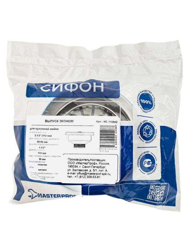 Выпуск для сифона, 3.1/2", с выпуском, в сборе, (нержавеющая чаша, пластиковая втулка и шток), белый, MasterProf, Эконом, ИС.110642