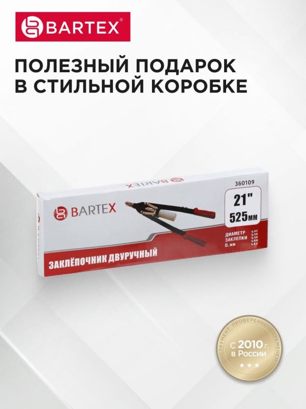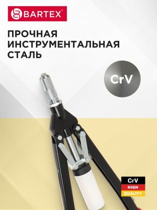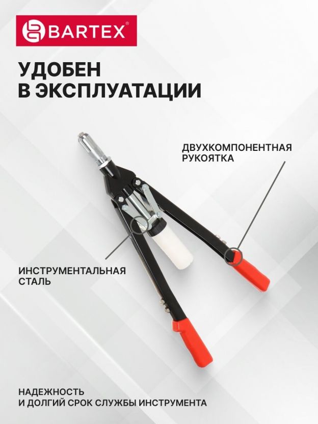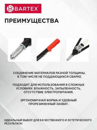 Ручной заклепочник Bartex – это отличная альтернатива для крепления металла в тех случаях, когда проведение сварочных работ невозможно или нецелесообразно. Вы сможете использовать этот инструмент практически в любых условиях: при повышенной влажности и запыленности, на высоте, когда нет электропитания. Эргономичная форма изделия и прорезиненные рукоятки обеспечивают надежный и удобный захват, что не позволит Вашим рукам устать даже при длительной нагрузке.