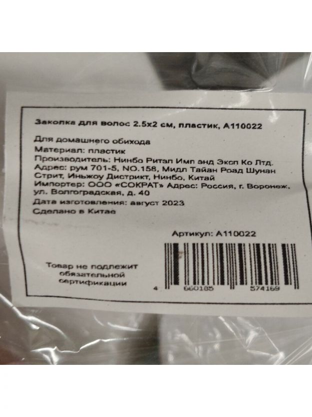 Заколка для волос 2.5х2 см, 6 шт, пластик, A110022