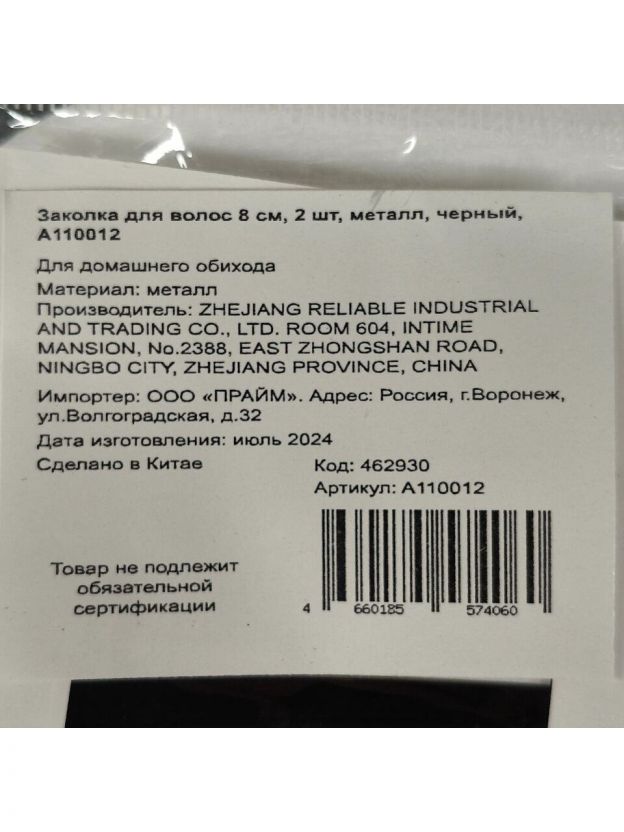 Заколка для волос 8 см, 2 шт, металл, черный, A110012