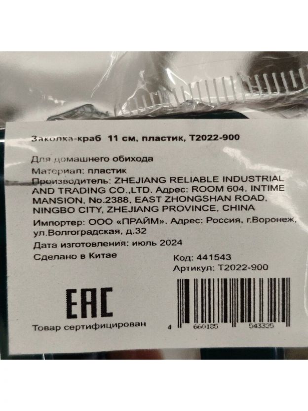 Заколка-краб для волос 11 см, пластик, T2022-900