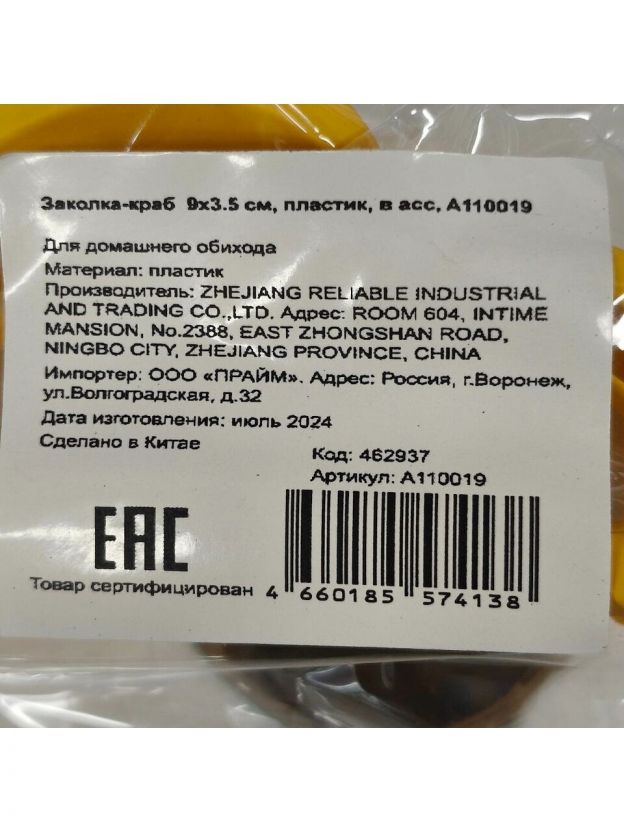 Заколка-краб для волос 9х3.5 см, пластик, в ассортименте, A110019