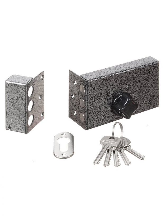 Комплектация - 5 ключей, запорная планка, накладка. Механизм замка под английский ключ, идет совместно с корпусом. Закрывание и открывание замка изнутри производится вертушкой, снаружи ключом.