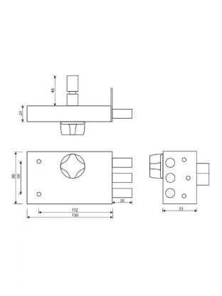 Замок накладной цилиндровый с вертушкой. Предназначен для установки на деревянные двери. Засов из трех цилиндрических ригелей диаметром 14 мм, с максимальным вылетом 30 мм. Удаление ключевого отверстия - 60 мм.