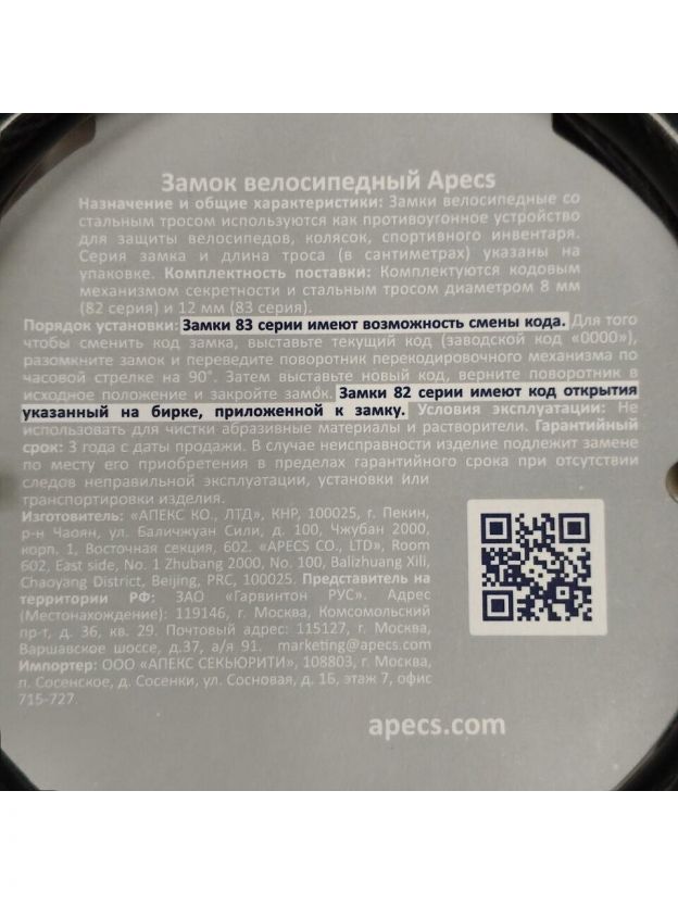 Велосипедный замок "Apecs" PD-82-65CM (закрывание кодом). Длина троса - 650 мм, диаметр троса - 8 мм.