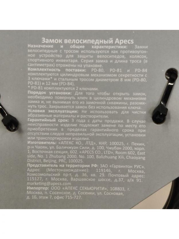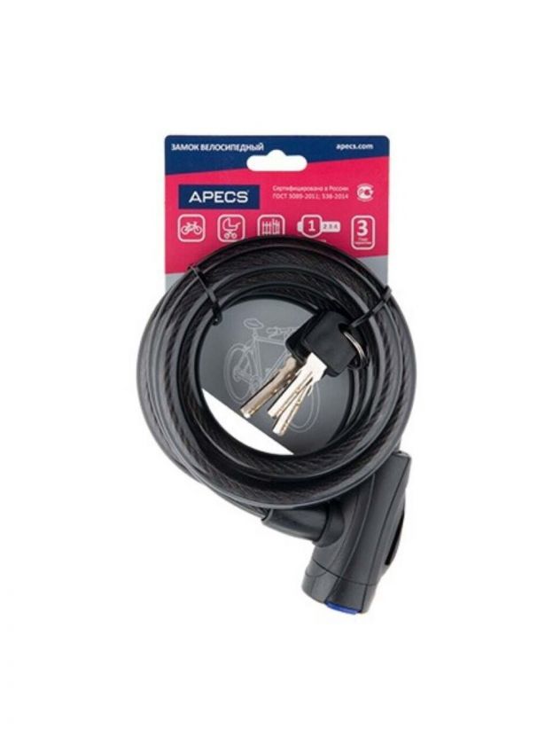 Замок предназначен для привязывания велосипедов, колясок, мотоциклов и др. движимого имущества. Замок автоматический, т.е. закрывается без использования ключа. В комплект входят 3 стальных ключа с пластиковой головкой.