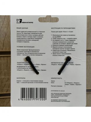 Навесной замок Авангард состоит из прочного стального троса в ПВХ-оболочке. Замок защитит вас от кражи велосипеда или коляски во время стоянки.