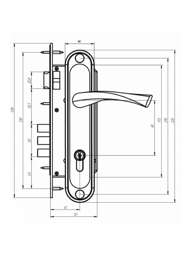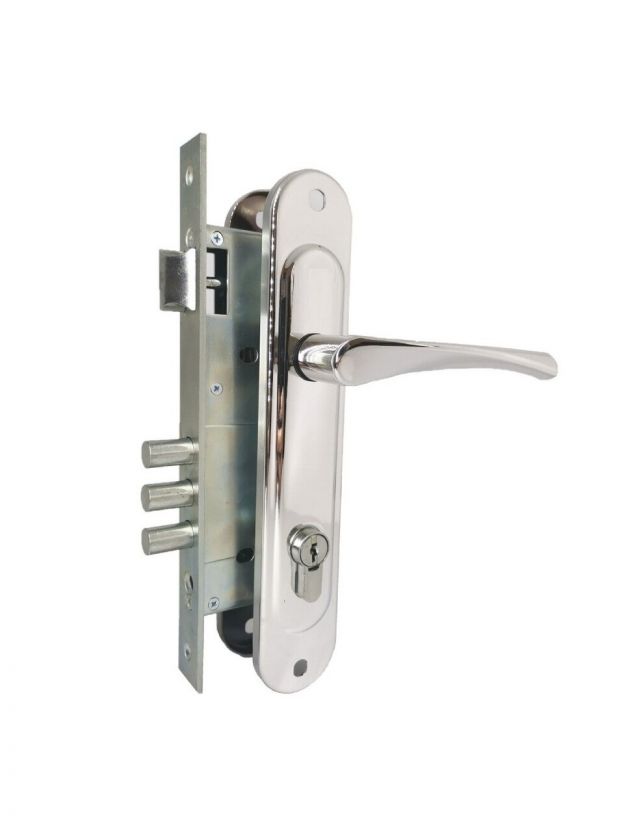 Замок врезной с ручками предназначен для установки в деревянные двери толщиной до 45 мм, правого и левого открывания. Ручки оснащены пружинами. Характеристики: Три стальных ригеля круглого сечения диаметром 12 мм, вылет 20 мм; Стальной корпус, покрыт гальваническим покрытием; Межосевое расстояние 85 мм; Удаление ключевого отверстия 45 мм; Материал: алюминиевый сплав;