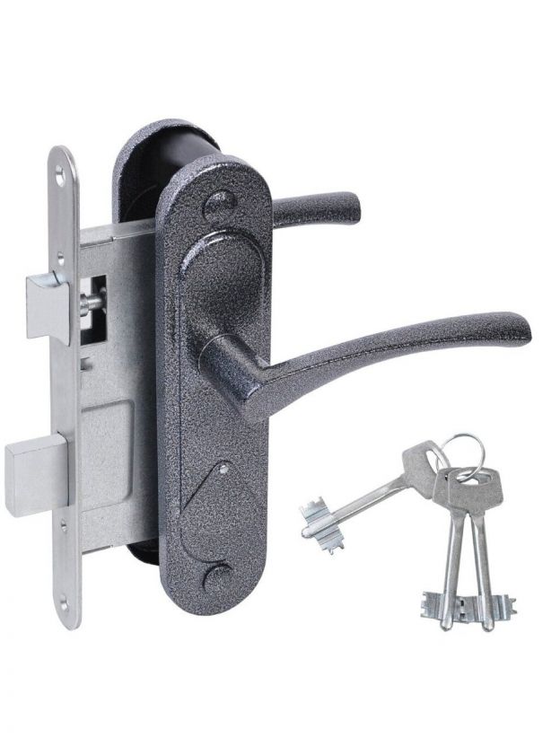 Материалы: корпус - сталь, засов и защелка - сталь, ручки - сплав алюминиевый, накладки - сталь.