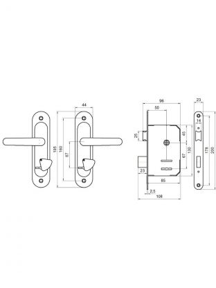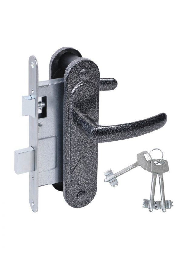 Замок врезной с ручками предназначен для установки в деревянные двери толщиной до 45 мм правого и левого открывания. Характеристики: Ригель прямоугольного сечения, вылет 22 мм. Универсальная защелка. Стальной корпус, покрыт гальваническим покрытием. Межосевое расстояние: 67 мм. Удаление ключевого отверстия: 55 мм. Материал ручек: алюминиевый сплав. Цвет: серебро-антик. Комплектация: замок, 3 ключа, ручки, ответная планка, винтовые стяжки.