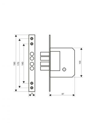 Замок врезной цилиндровый АЛЛЮР 189-4, под крестообразный ключ. Предназначен для установки в деревянные двери. Корпус - стальной покрыт полимерной краской, засов из четырех стальных цилиндрических ригелей, диаметром 12мм.