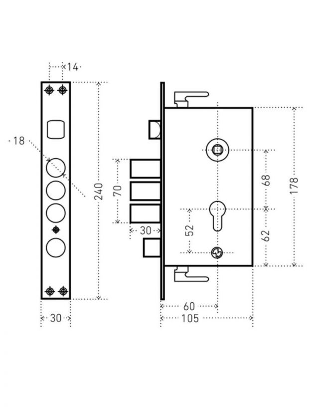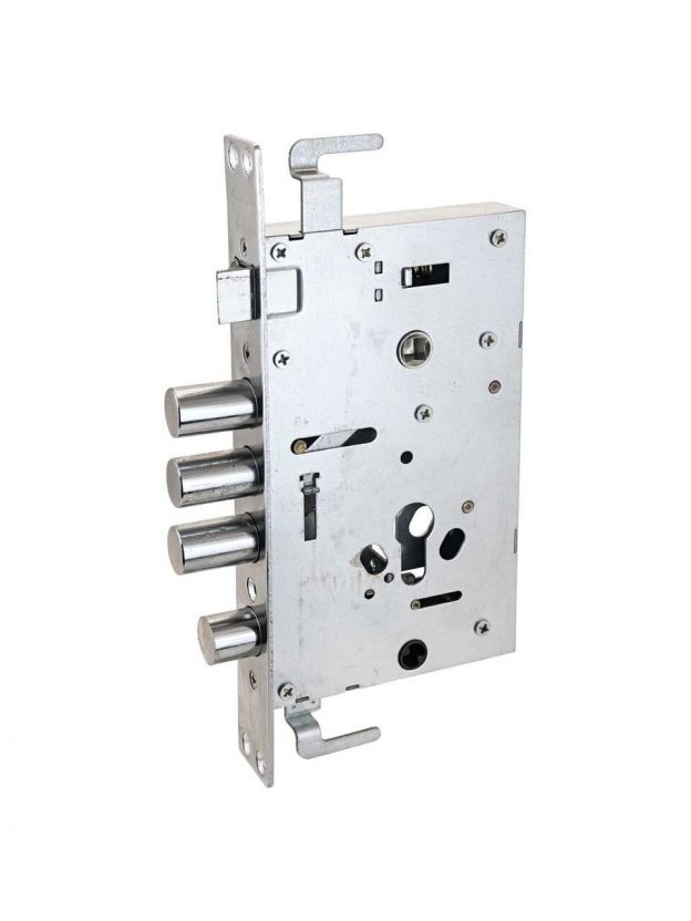 Аллюр ЗВ1-08А-C AТМ-R - врезной цилиндровый замок с защелкой и задвижкой без механизма секрета. Предназначен для установки в правые китайские металлические двери в качестве основного замка. Замок закрывается снаружи автоматически поднятием ручки вверх. Характеристики: Количество ригелей: 3; Материал ригелей: сталь; Диаметр ригелей: 18 мм; Вылет ригелей: 30 мм; Корпус замка: сталь, толщина 1,1 мм; Удаление ключевого отверстия: 60 мм; Межосевое расстояние: 68 мм; Расстояние от центра механизма секрета до задвижки: 52 мм; Цвет торцевой планки: хром; Ширина торцевой планки: 30 мм. Габаритные размеры отверстия для личинки замка: 17х33 мм.