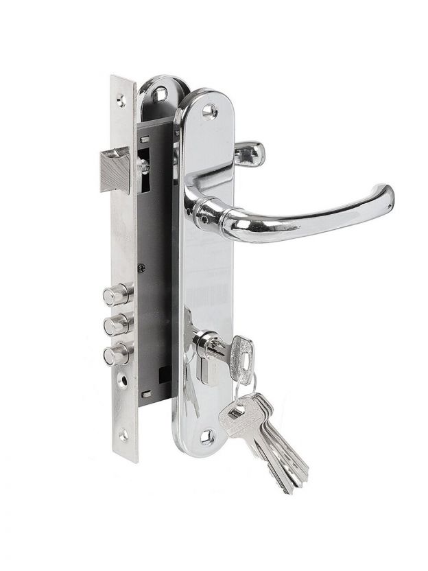 Серия врезных замков с широким ассортиментом форм и цветов ручек на планке. Также в этой серии представлены замки без ручек в комплекте. Все замки укомплектованы надёжными цилиндровыми механизмами секретности длиной с ключами английского типа или профильными. Сертифицированы на 2 класс по российскому ГОСТ, по безотказности работы засова и защёлки соответствуют 4 классу. Назначение: Общее. Тип крепления: Лицевая планка. Тип ригелей: Цилиндрические. Количество ригелей: 3. Вылет ригелей: 20 мм. Диаметр ригеля: 12 мм. Удаление ключевого отверстия (Backset): 45 мм. Тип механизма секретности: Цилиндровый. Тип цилиндрового механизма: Евроцилиндр. Тип ключа: Английский. Количество ключей: 5 шт. Механизм постоянного ключа: Нет. Комплектация цилиндром: Комплектуется. Типоразмер цилиндра: 30/30 мм. Материал цилиндра: Латунь. Покрытие цилиндра: Гальваника. Цвет цилиндра: Хром. Дополнительный механизм секретности: Нет. Защелка: Классическая. Тип защелки: Универсальная. Межосевое расстояние: 85 мм. Комплектация ручками: Комплектуется. Способ установки ручки: Стяжки. Материал ручки: ЦАМ. Покрытие ручек: Гальваника. Цвет ручки: Хром. Автоматическое запирание: Не автоматическое. Количество точек запирания: 1. Дополнительное запирание изнутри: Нет. Покрытие лицевой планки: Гальваника. Цвет лицевой планки: Хром.