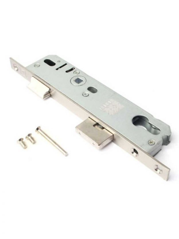 Врезные замки для дверей из ПВХ профиля. Ассортимент представлен моделями с роликовым фиксатором и моделями под ручку с фалевой защелкой. Замки не комплектуются ответной планкой. Характеристика: Тип ригелей: прямоугольный; Вылет ригелей: 20 мм; Удаление ключевого отверстия: 30 мм; Тип механизма секретности: цилиндровый; Тип защелки: универсальная; Межосевое расстояние: 92 мм; Цвет: никель;
