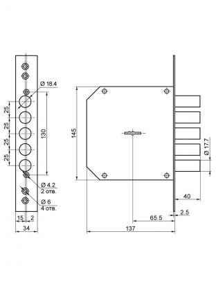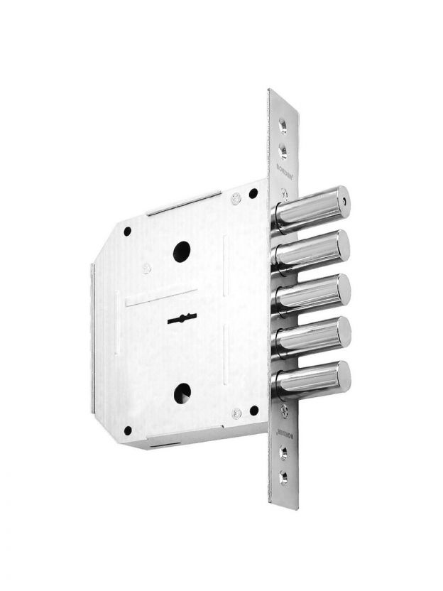 Врезной замок предназначен для на установки на входную дверь. Поставляется с личинкой под сувальдный ключ. Имеет целый ряд защитных конструктивных преимуществ от криминального вскрытия: 5 ригелей с вылетом 40 мм., оцинкованный корпус с надежной защитой от коррозии. Высокая степень защиты от силового взлома. Количество штырей 5 шт. Вылет ригелей 40 мм Диаметр ригелей 17.7 мм Длина ключа 102 мм Количество ключей 5 шт. Материал ключа латунный с пластиковой головой Бэксет 65.5 мм. Длина планки: 244 мм.