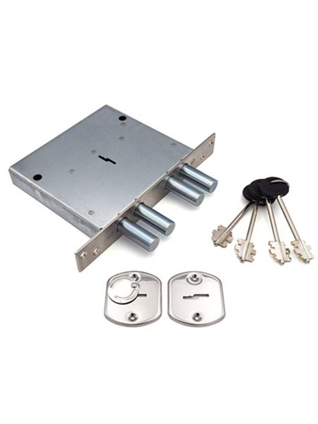 Замок запирает дверь четырьмя стальными ригелями диаметром 16 мм, которые выдвигаются из корпуса замка на 40 мм.